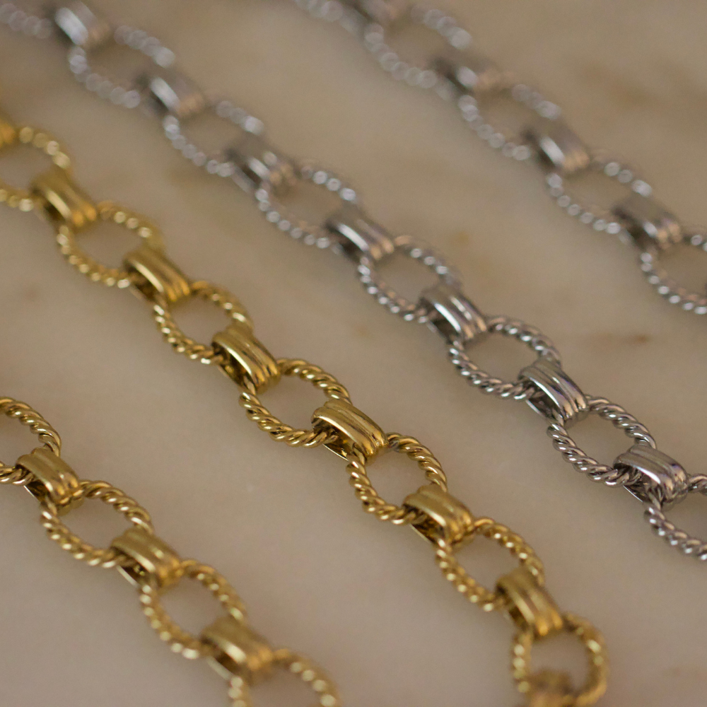 Timeless, textured, and effortlessly chic — the Laurel Link Bracelet is a statement piece that elevates any stack. Crafted from waterproof stainless steel, each interlocking link combines a smooth polished center with a twisted rope edge, giving the bracelet a bold yet classic finish.