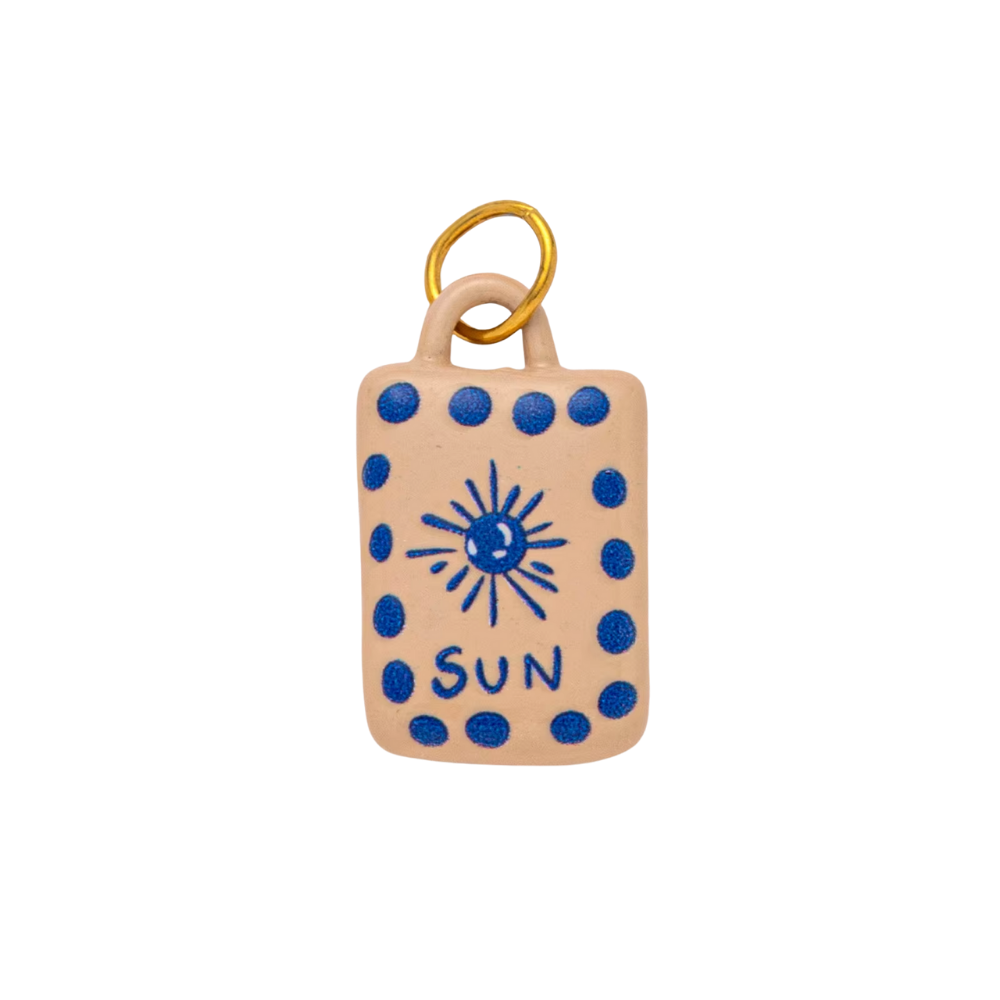 The Ceramic Sun Charm features a handcrafted blue sun design on a warm peach background with a stainless steel jump ring, perfect for charm bars, necklaces, and personalized jewelry. This artisan piece adds cheerful, positive energy to any look and layers beautifully with other charms for a curated, sunshine-inspired style.