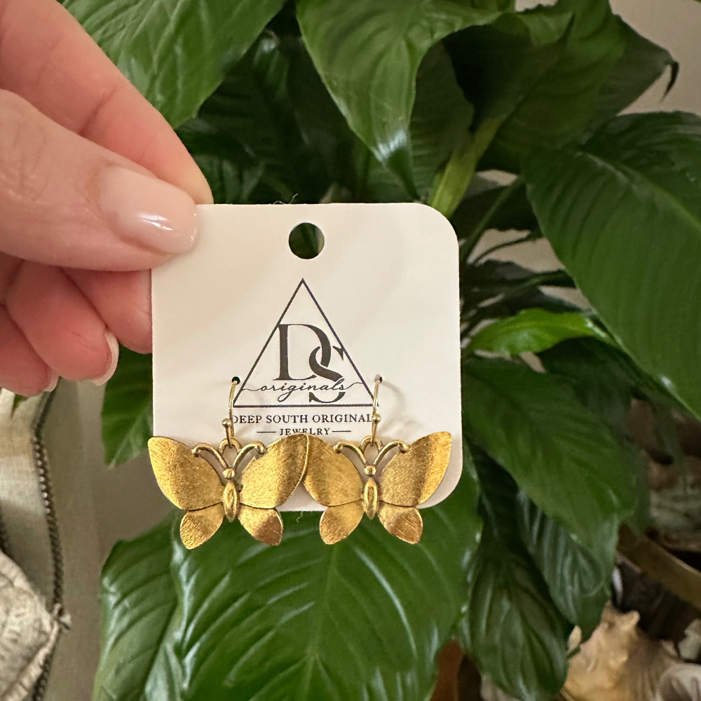 Graceful and timeless, the Golden Flutter Earrings capture the delicate beauty of a butterfly in motion. Each pair is handcrafted in the USA and finished in antiqued 12k gold over pewter, bringing a soft, brushed glow that complements every style.