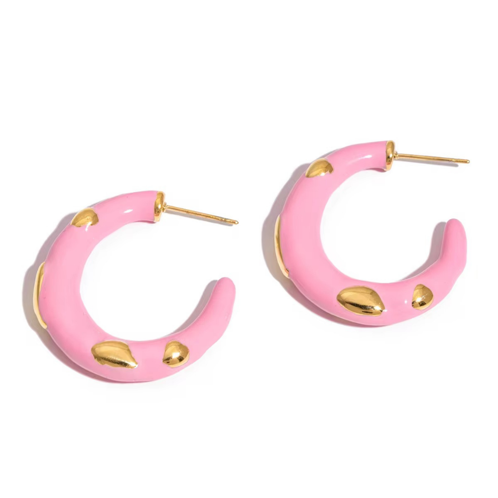 Add a playful pop of color to your look with these stunning pink enamel hoop earrings featuring gold accent details. These chunky hoops combine vibrant pink enamel with polished gold accents, creating a fun yet sophisticated statement piece that's perfect for everyday wear or special occasions.