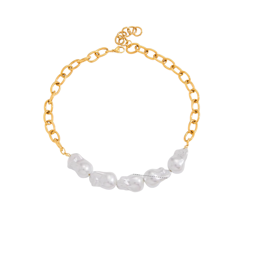This timeless piece combines lustrous baroque-style pearls with a bold gold link chain, creating the perfect balance of modern sophistication and classic charm. Each pearl is uniquely shaped, adding texture and individuality to your look.