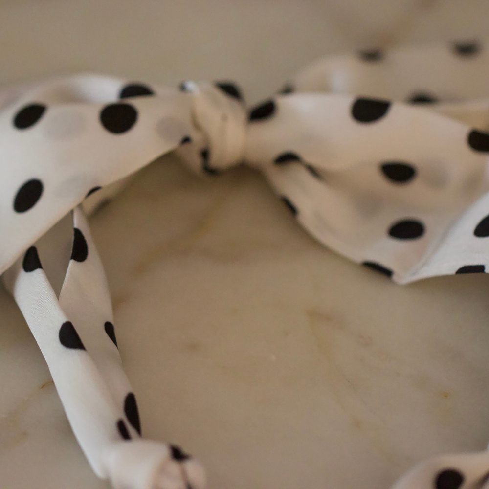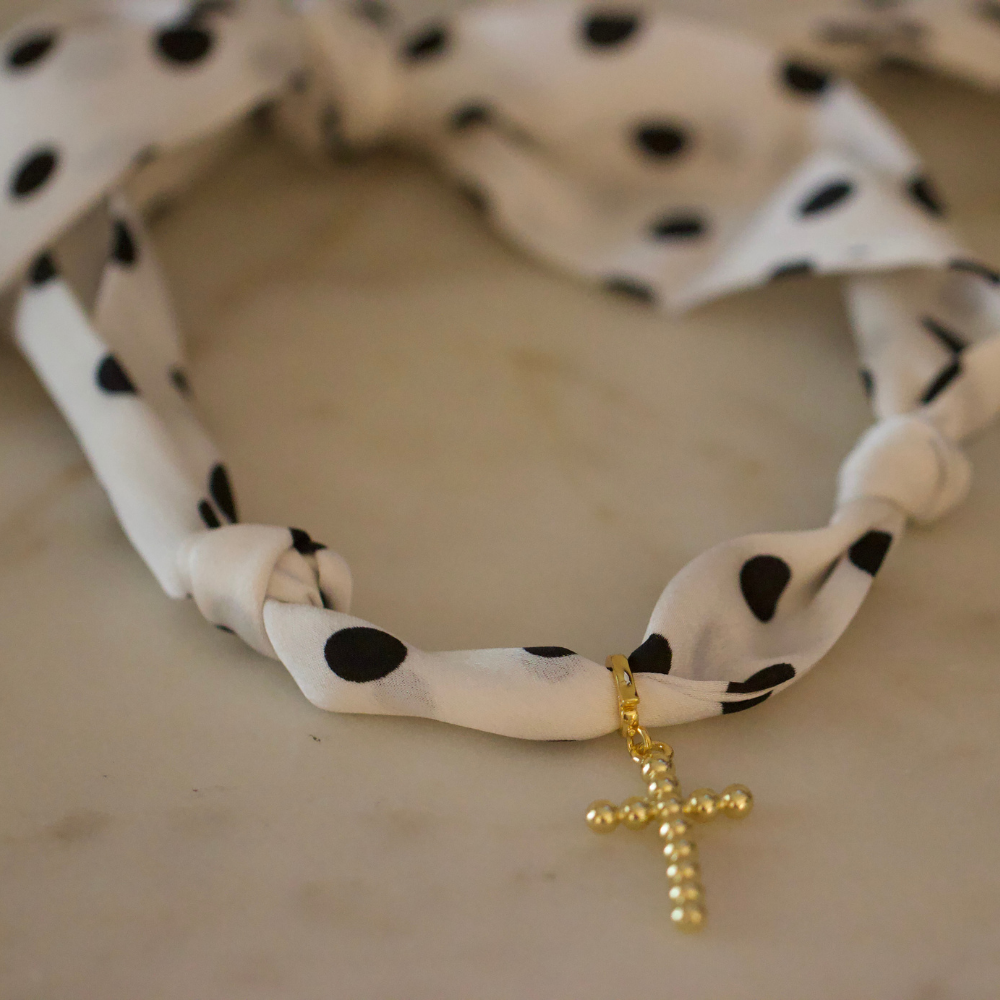 Playful pattern meets timeless faith with the Polka Dot Cross Scarf Bracelet. This bracelet features a soft black and white polka dot scarf band accented by a gold beaded cross charm that brings a touch of meaning and shine. The mix of fun, fashion, and faith makes it a standout piece for any collection.