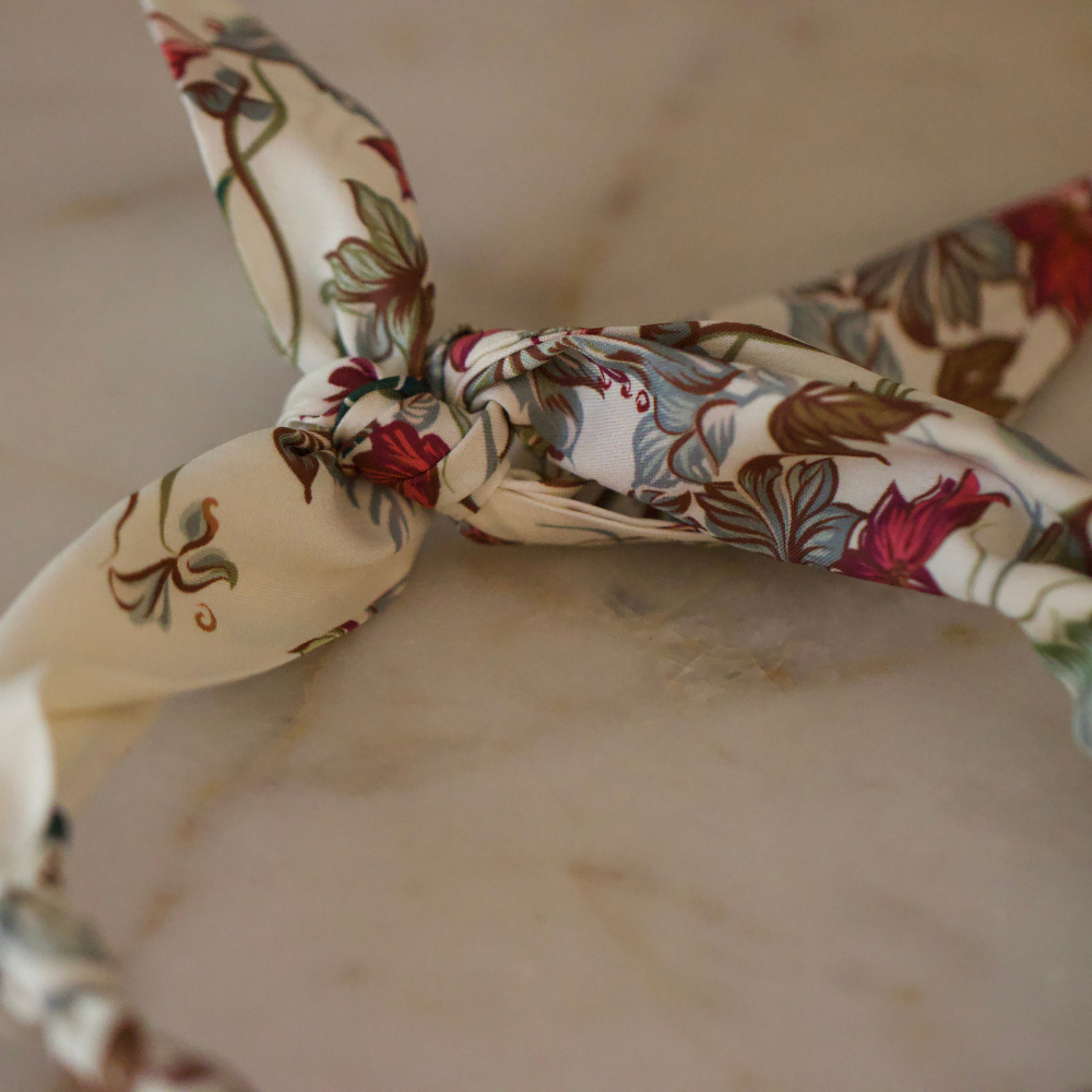 A best seller for every season, the Blossom Heart Scarf Necklace blends floral beauty with a touch of romance. The cream-toned scarf features a delicate fall floral print in rich shades of burgundy, olive, and sage, tied gracefully around a gold and mother-of-pearl heart pendant.