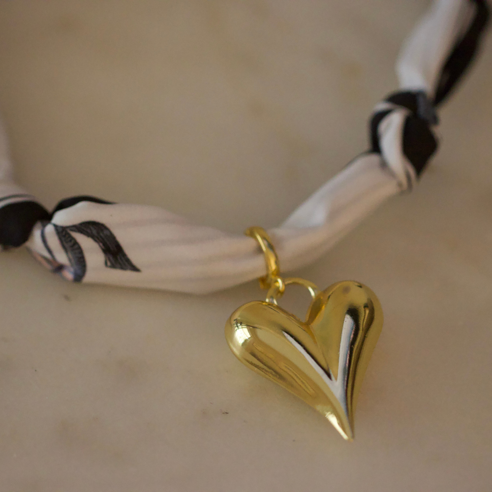 Sleek, classic, and fashion-forward — the Golden Heart Scarf Bracelet brings a modern twist to a timeless favorite. The black and white patterned scarf band ties gracefully around the wrist, accented by a high-shine gold heart charm that captures both softness and strength in its curved design.