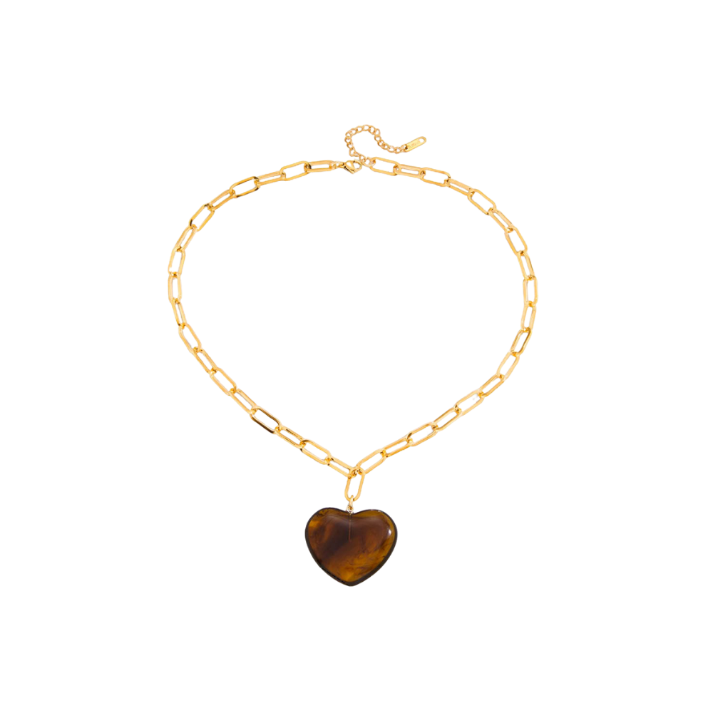 This statement piece features a bold gold paperclip chain paired with a marbled resin heart pendant that adds a touch of warmth and sophistication. Available in rich tortoise brown or creamy ivory, each heart is uniquely patterned, making every necklace one of a kind.