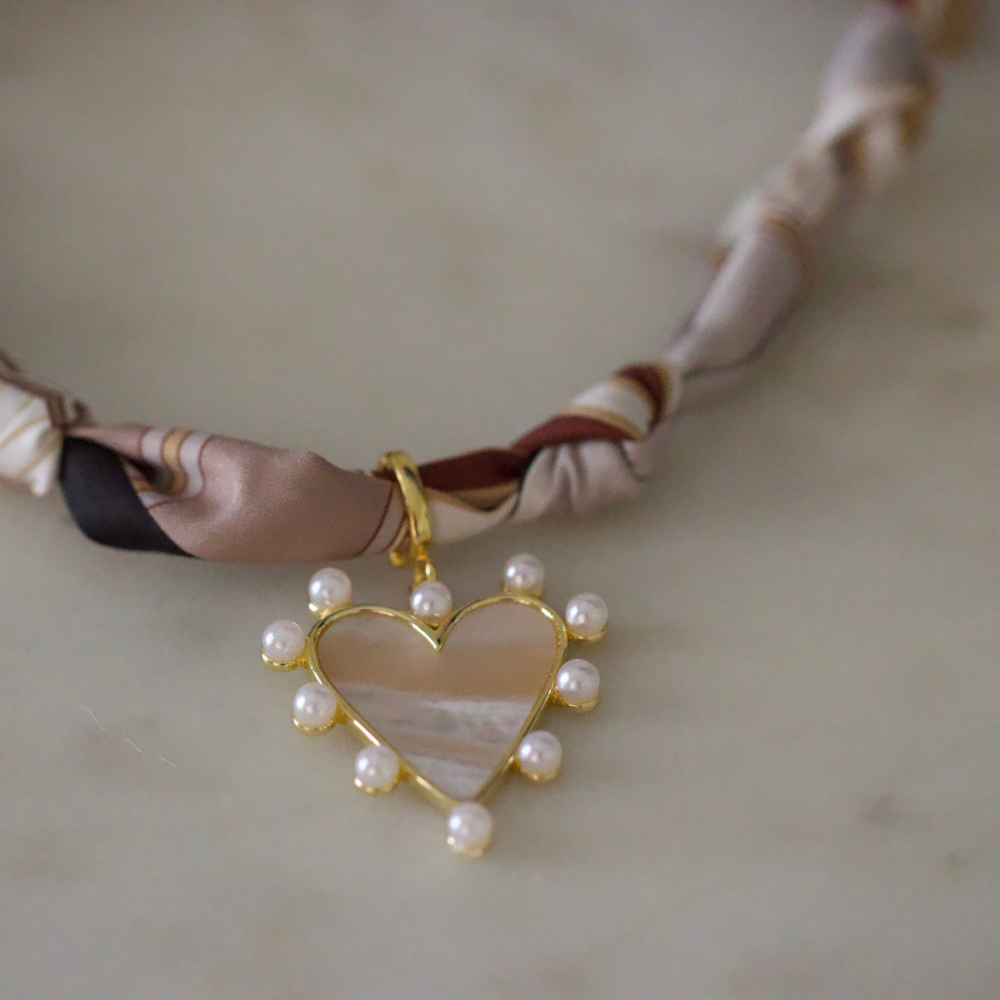 Add a touch of soft sophistication with the Mocha Pearl Heart Scarf Necklace. This piece pairs a silky scarf in rich mocha and cream tones with a gold-framed heart pendant trimmed in petite pearls and a glossy shell inlay. The neutral palette and delicate details make it effortlessly chic — perfect for both boutique displays and everyday styling.