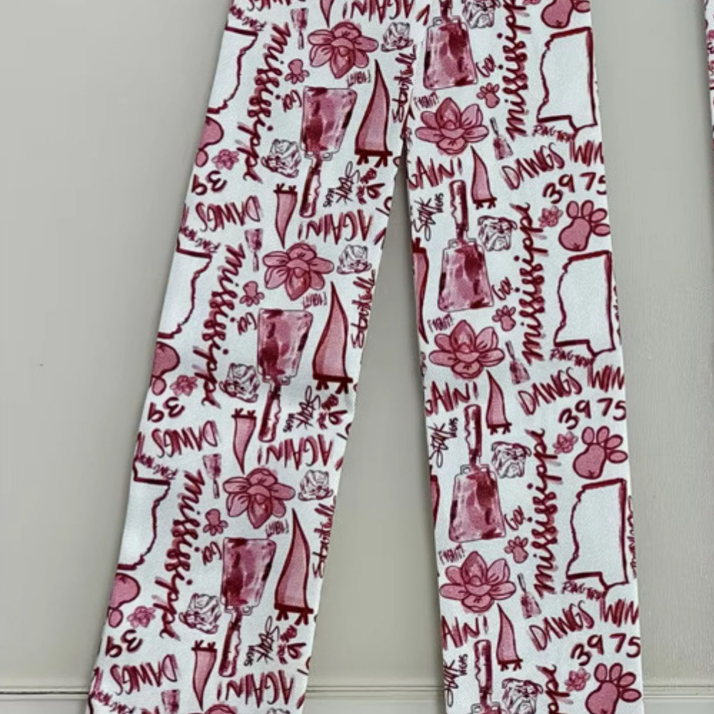Celebrate game day in style with the Starkville Tailgate Scarf. Featuring a spirited maroon and white design with nods to Mississippi traditions, tailgating, and Bulldog pride, this scarf is perfect for showing your school spirit. Wear it as a neck scarf, tie it on your bag, or style it in your hair for a fun and versatile accessory that’s ready for any gameday event.