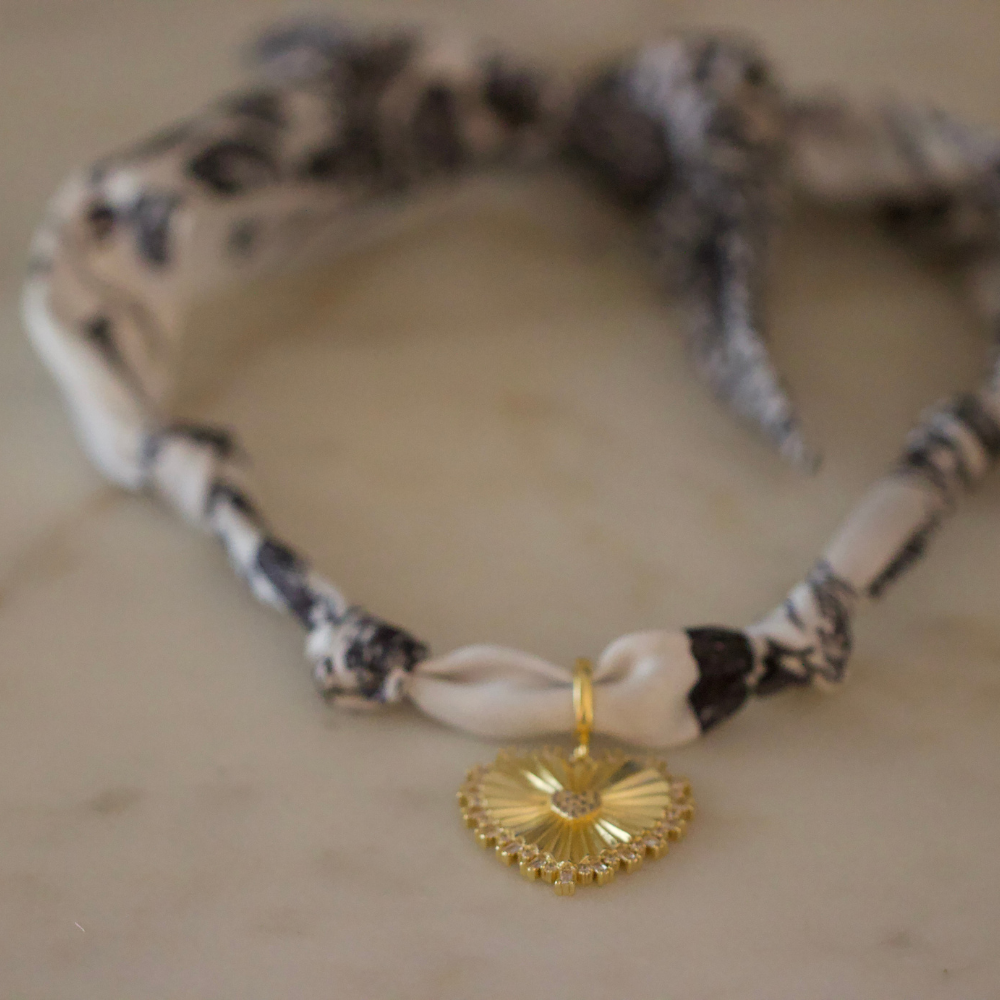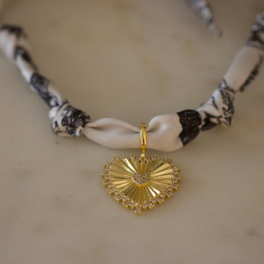 Classic, timeless, and full of charm — the Toile Heart Scarf Necklace brings elegant contrast and effortless style. The cream-and-black toile-inspired scarf is knotted and threaded with a radiant gold heart pendant, detailed with tiny CZ stones that catch the light beautifully.