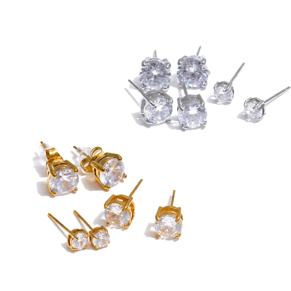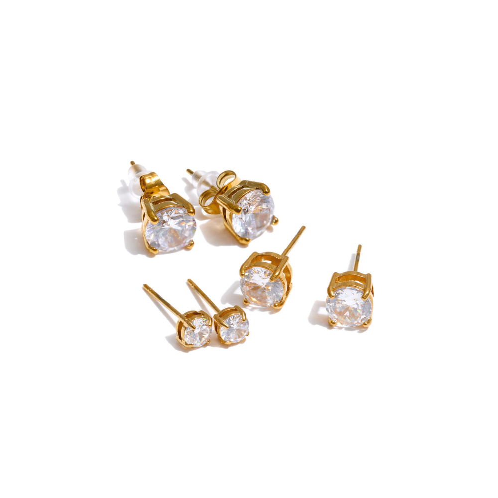 The Classic CZ Stud Set features three pairs of sparkling round CZ stud earrings in 18k gold plated or silver stainless steel, perfect for adding versatile sophistication to any look. This essential set includes 8mm, 6mm, and 4mm studs that add elegant charm and work beautifully worn solo or mixed and matched for a curated, contemporary style.