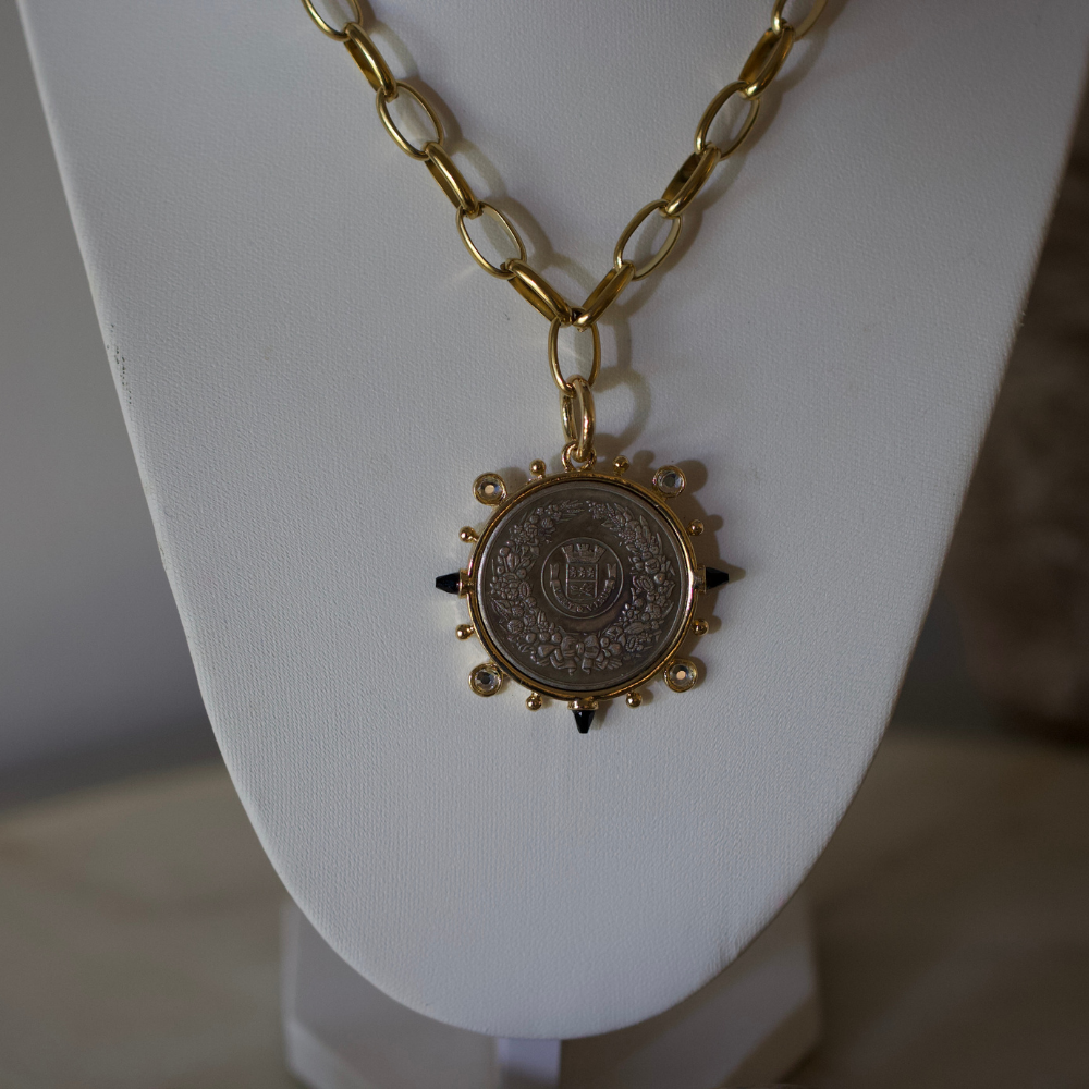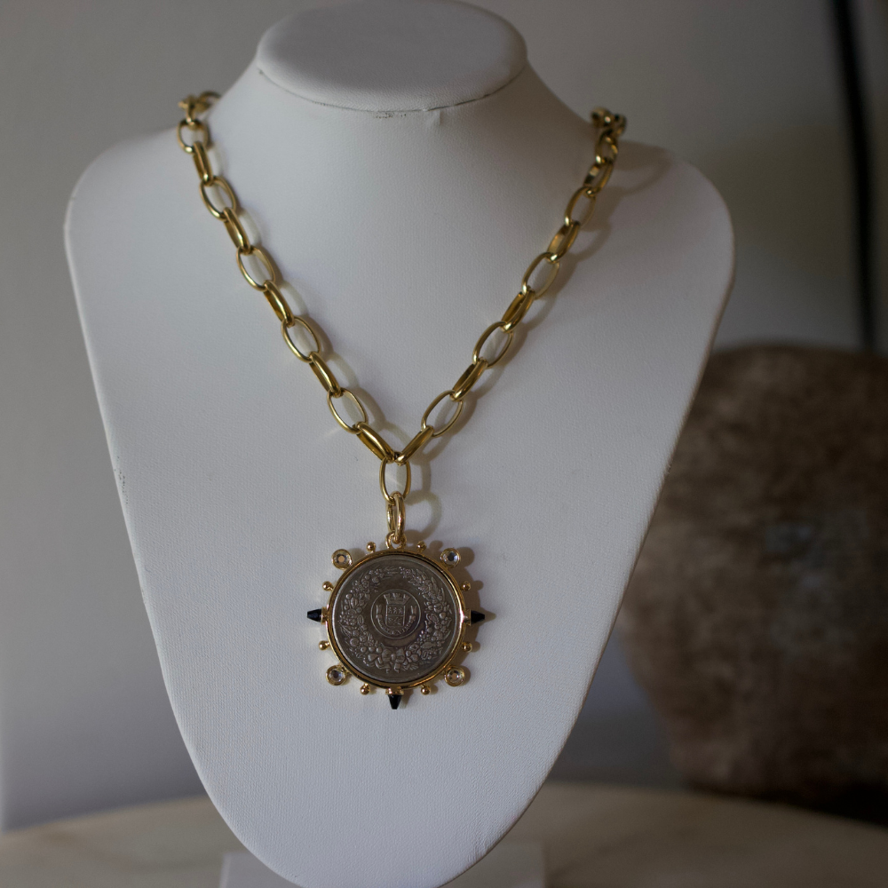 Elevate your style with the Crest Emblem Coin Necklace—a bold symbol of heritage and classic craftsmanship. The finely detailed crest sits in a unique star-point bezel that adds a modern edge, making it a standout piece for anyone who loves meaningful statement jewelry.