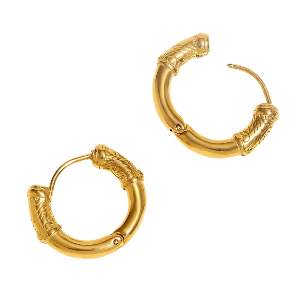 The Engraved Gold Hoop Earrings feature a polished gold finish with beautiful etched detailing that gives them a timeless look with added texture. These non tarnish hoops are designed for everyday wear and bring an elevated touch to both casual and dressed up styles.