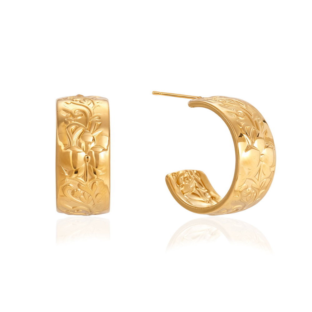 The Flora Hoops feature a bold chunky hoop design with embossed floral detailing in 18k gold plated stainless steel, perfect for adding vintage-inspired sophistication to any look. These statement earrings add timeless charm and work beautifully worn solo or paired with the matching Flora Bracelet for a curated, contemporary style.