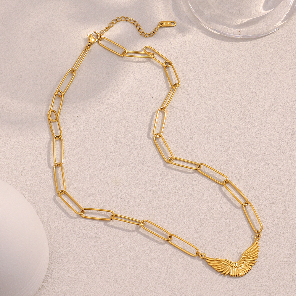Embrace divine style with this stunning gold angel wing necklace featuring a beautifully detailed wing pendant on a modern paperclip chain. This statement piece combines celestial symbolism with contemporary design to create a meaningful accessory you'll treasure.
