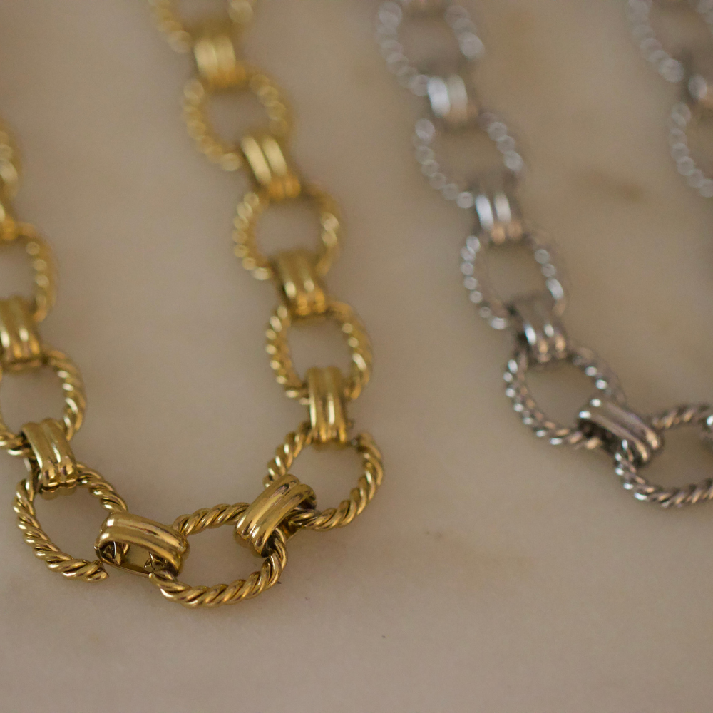Make a bold yet classic statement with the Laurel Link Necklace. Designed with textured rope-style links and smooth polished connectors, this piece blends modern shine with timeless craftsmanship. Its substantial design feels luxurious while remaining lightweight and comfortable for everyday wear.