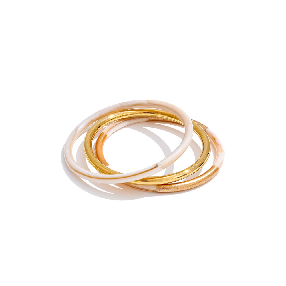 The Margo Bangle Set brings a fresh take on timeless style with three interlocking bangles crafted from smooth resin and polished stainless steel. Each set blends glossy gold with marble or enamel tones, creating a look that’s both sophisticated and easy to wear. Available in Ivory Mix and Black Mix.