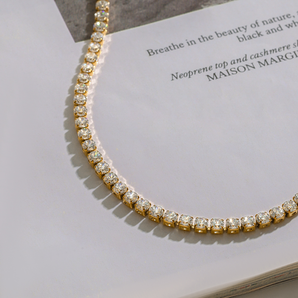 This elegant piece features a half tennis chain of high-quality cubic zirconia paired with a sleek 18k gold-plated stainless steel link chain. The mixed texture and shimmer give it a modern, elevated look that transitions effortlessly from day to night.