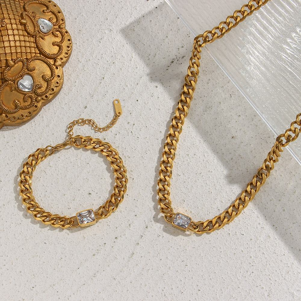 The Sloane 18k Gold Plated Stainless Steel Bracelet is the perfect companion to the Sloane Necklace. Designed with a bold curb chain and a square cubic zirconia centerpiece, this bracelet delivers a polished look that feels both modern and timeless.