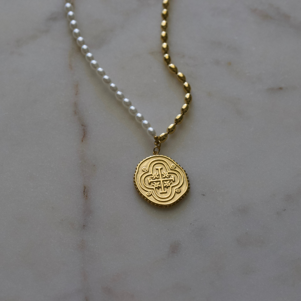 A modern take on timeless faith. The Solene Necklace pairs half luminous glass pearls with radiant gold-plated beads, creating a striking contrast that feels both classic and contemporary. At its center, a detailed Benedictine Cross medallion adds a meaningful touch — symbolizing protection, peace, and devotion.