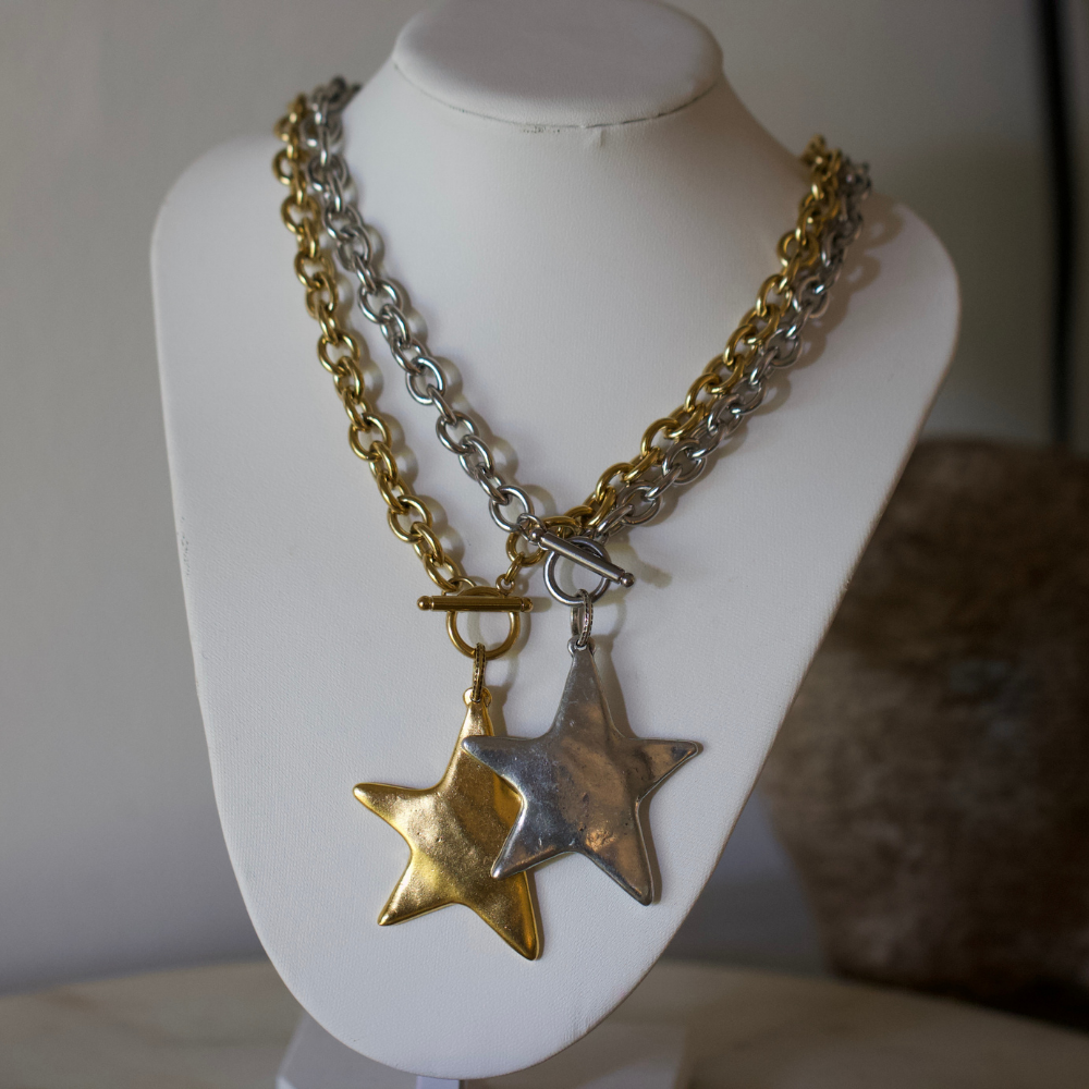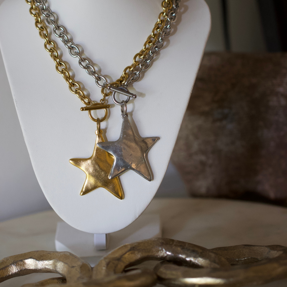 Shine with effortless style in the Starlight Toggle Necklace. This mixed-metal design features bold gold and silver star charms paired with a chunky toggle chain—one of the most loved styles among customers. The double-star look brings a playful, modern edge while still keeping things chic and statement-ready. Perfect for layering or wearing solo, it’s the kind of piece shoppers reach for day after day.