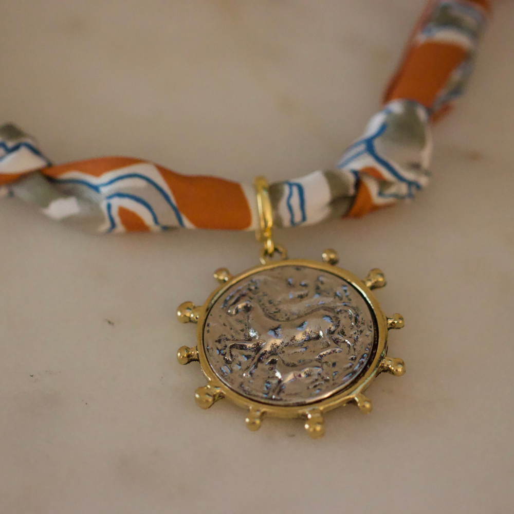 Celebrate bold style and graceful strength with the Terra Mare Scarf Necklace. This eye-catching piece features an orange patterned scarf adorned with galloping horses — a design that captures the beauty of freedom and movement. At its center, a two-tone coin pendant framed in gold adds a touch of vintage charm and refinement.