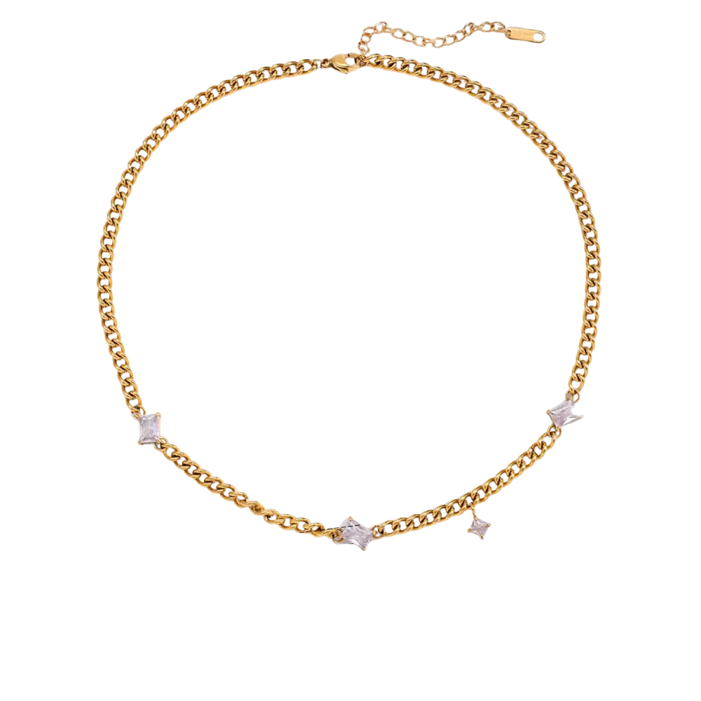 The Torino Chain Necklace features a bold curb chain adorned with star-shaped CZ stones in 18k gold plated stainless steel, perfect for adding modern sophistication to any look. This statement necklace adds glamorous charm and works beautifully worn solo or layered with other necklaces for a curated, contemporary style.