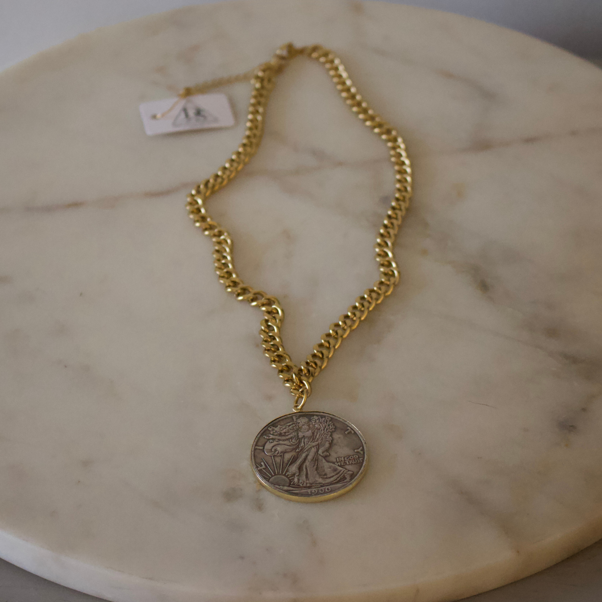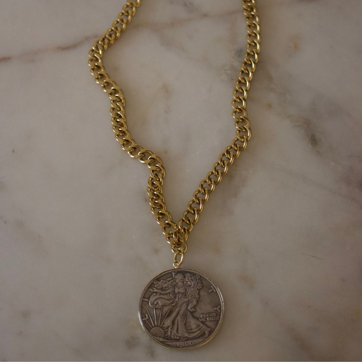 A timeless statement necklace inspired by vintage coin jewelry. The Two Tone Liberty Coin Necklace features a replica liberty coin paired with a classic flat curb chain for a bold yet wearable look.