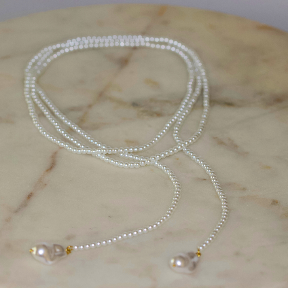 Make a statement in timeless style with the Wrap Pearl Lariat Necklace. This versatile 48-inch strand features luminous glass pearls accented with organic baroque-style drops on each end. Classic yet modern, it can be styled in endless ways—wrap it once for a long layered look, tie it in front for a chic lariat, or double it up for a sophisticated twist.