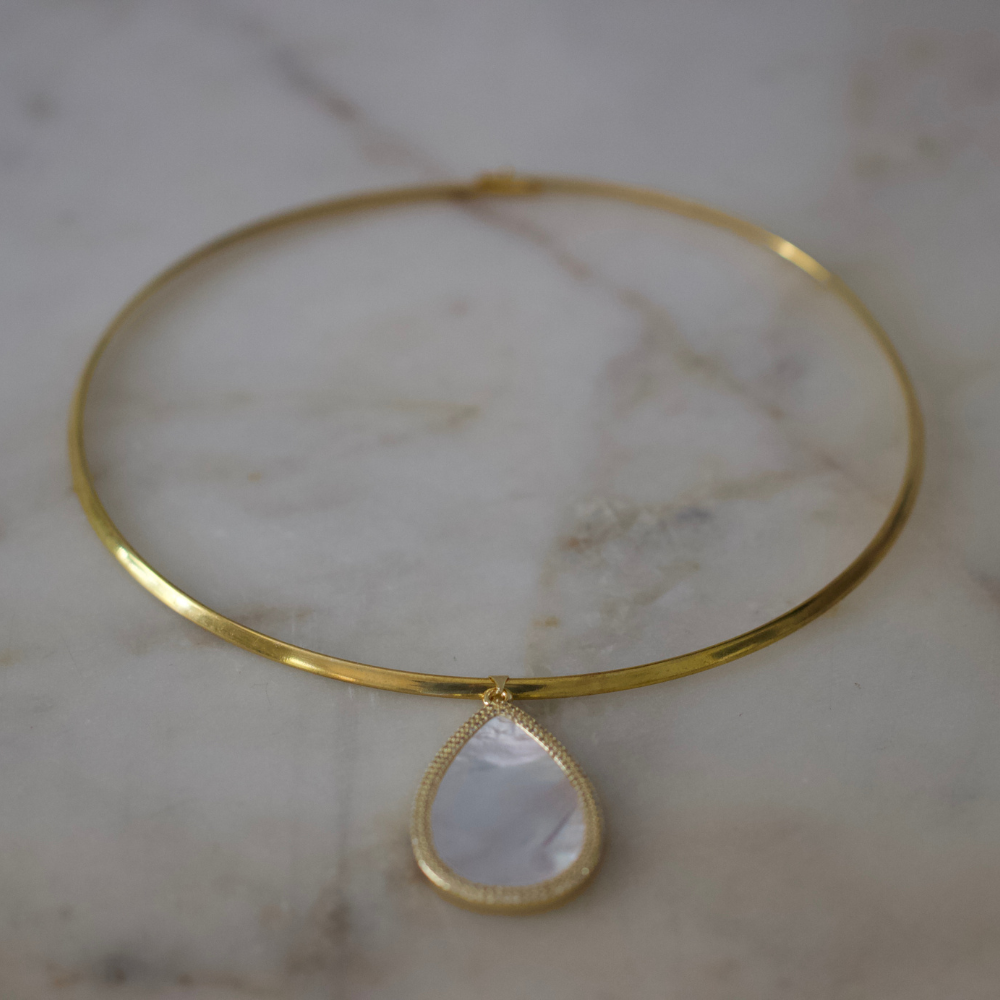 This mother-of-pearl teardrop choker necklace is a bold yet feminine statement piece, crafted to stand out with ease. A gleaming 18k gold-plated stainless steel collar frames a luminous teardrop pendant inlaid with mother-of-pearl and surrounded by delicate detailing.
